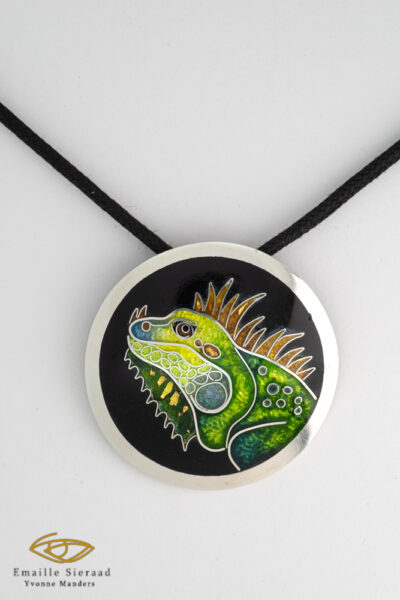 Deze hanger is gemaakt in de klassieke Champlevé- cloisoinné techniek. Er zijn stukjes 24 karaat goud toegevoegd om wat extra 'sparkle' toe te voegen. ... Read More about Groene leguaan hanger