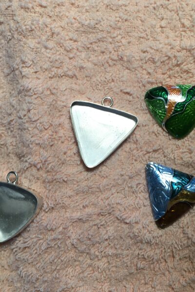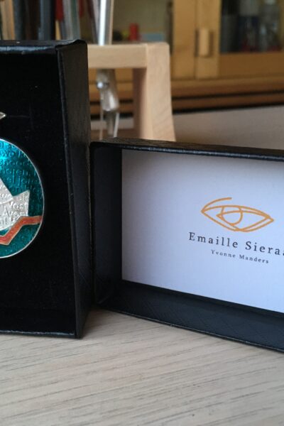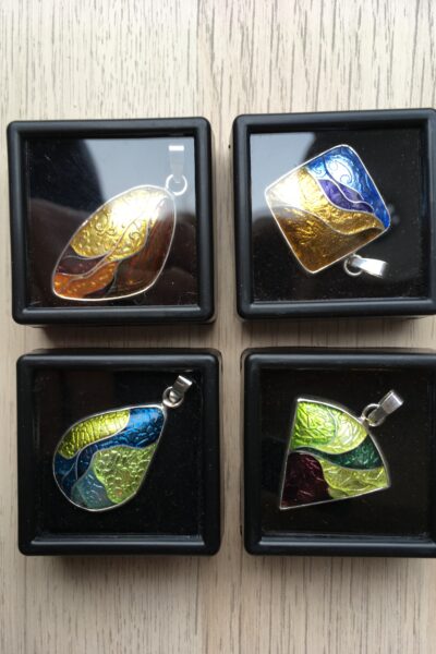 Hier zijn de bakjes gemaakt en het oogje is eraan gesoldeerd. De geëmailleerde plaatjes worden nu in de bakjes gelegd en de zilveren randen worden een beetje omgevouwen zodat de emaille niet uit de hanger valt. Dit is een secuur werkje; op plaatsen wordt het emaille plaatje wat opgehoogd en de ... Read More about Klaar om te zetten