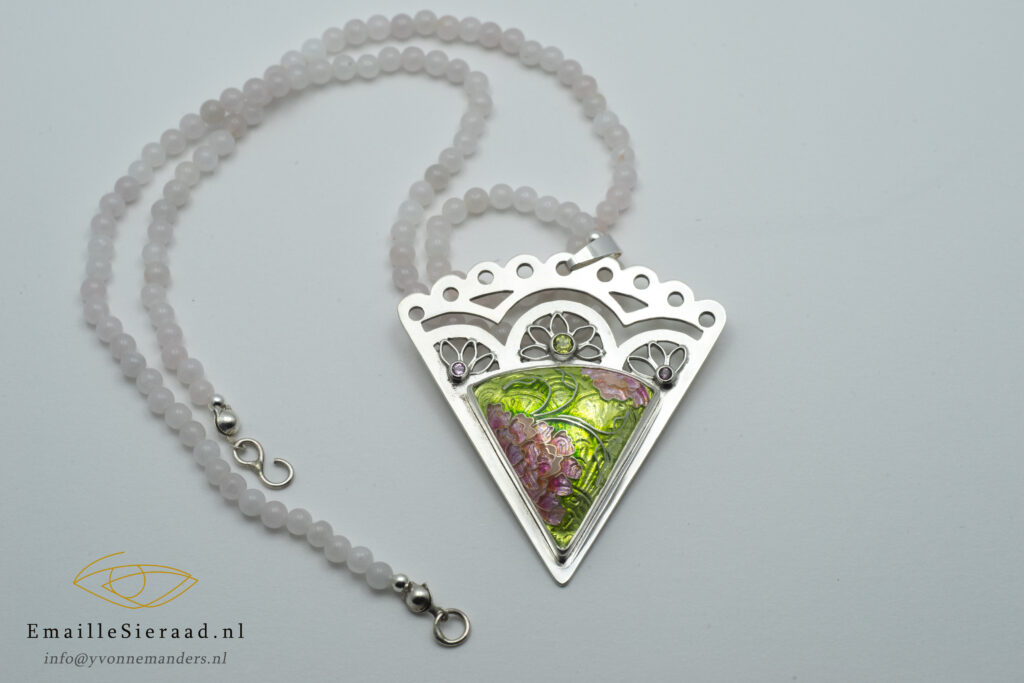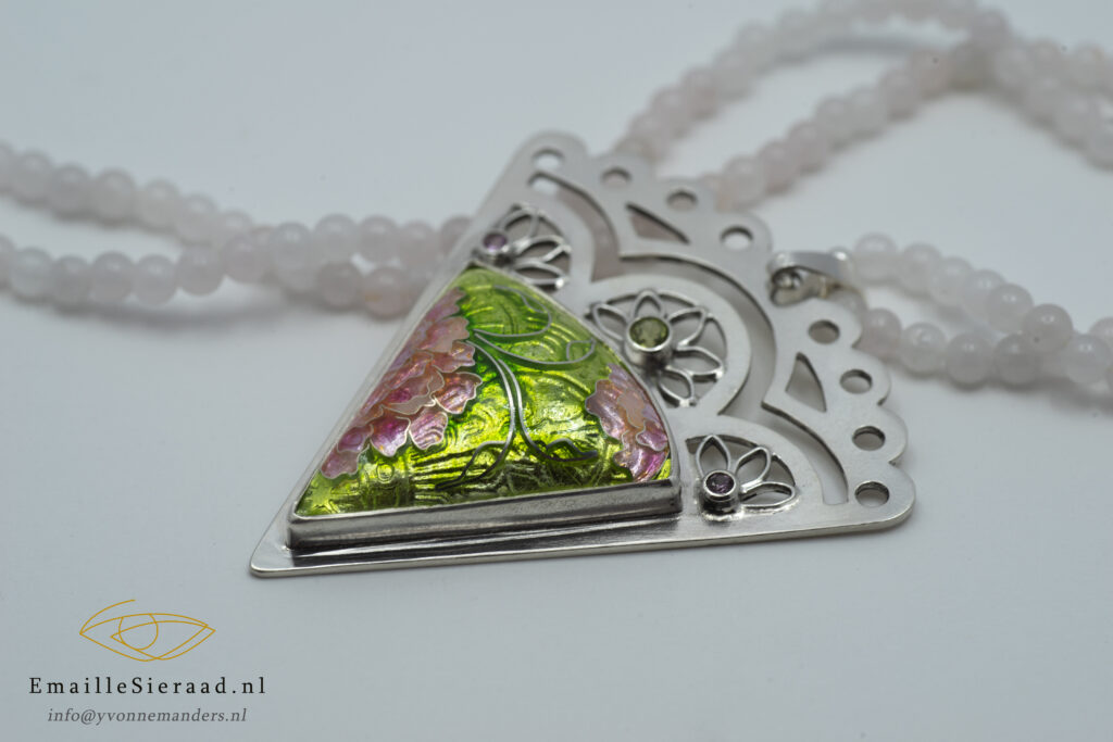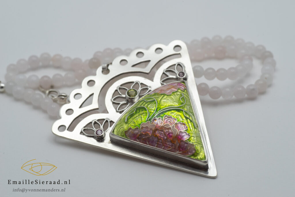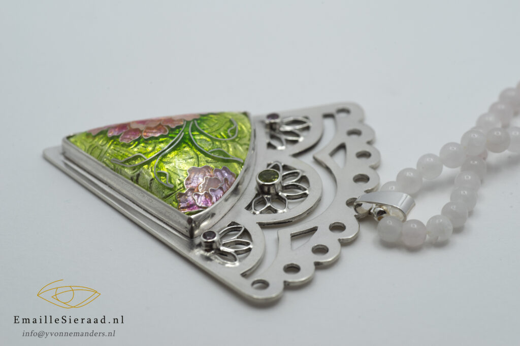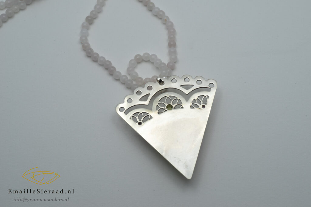 Nu het frame helemaal klaar is kunnen de stenen en het emaille worden gezet. Bij het zetten wordt een randje zilver over de steen/emaille-werkstuk ‘gevouwen’. Hier komt wat kracht bij kijken.