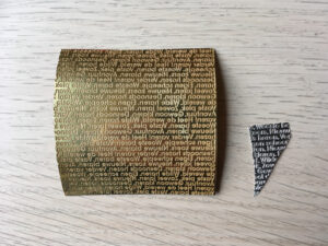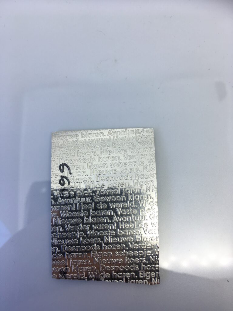 Van de tekst etste ik een plaat die ik kan gebruiken om een afdruk in zilver te maken. De gele, messing plaat staat in spiegelbeeld en wordt straks gebruikt om de zilveren plaat te walsen. Ernaast ligt een proefje in zilver.