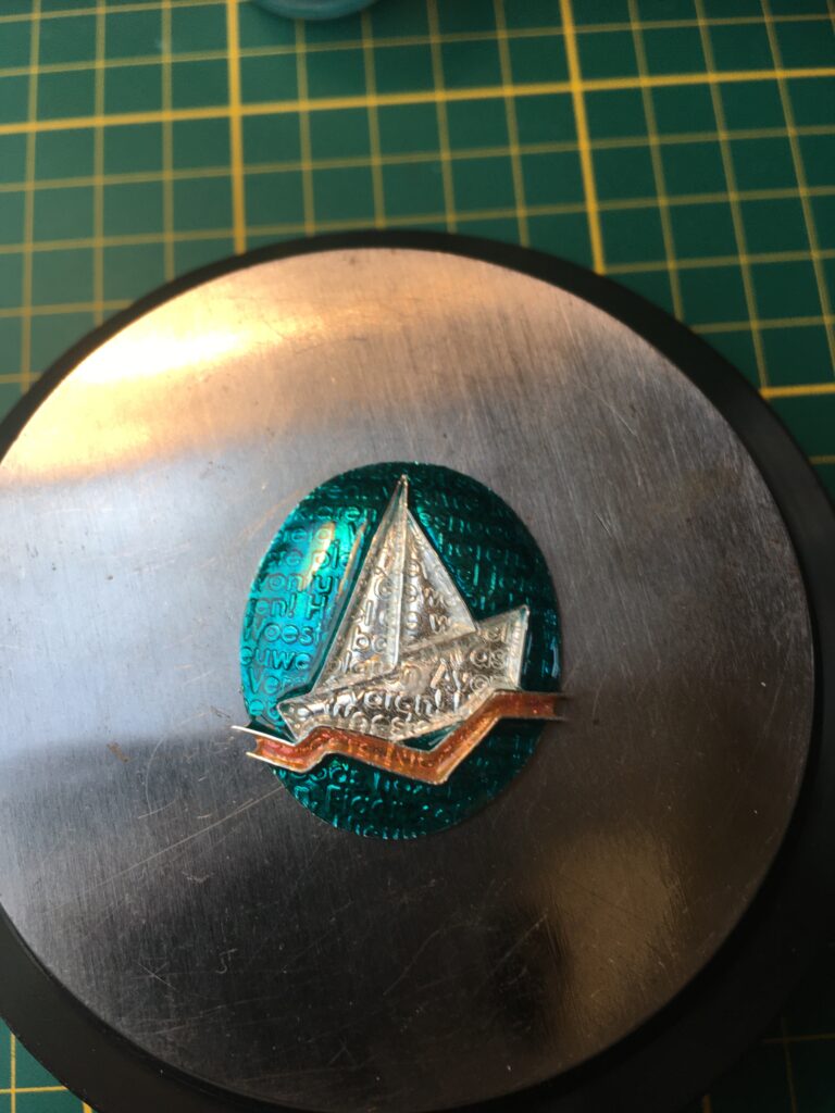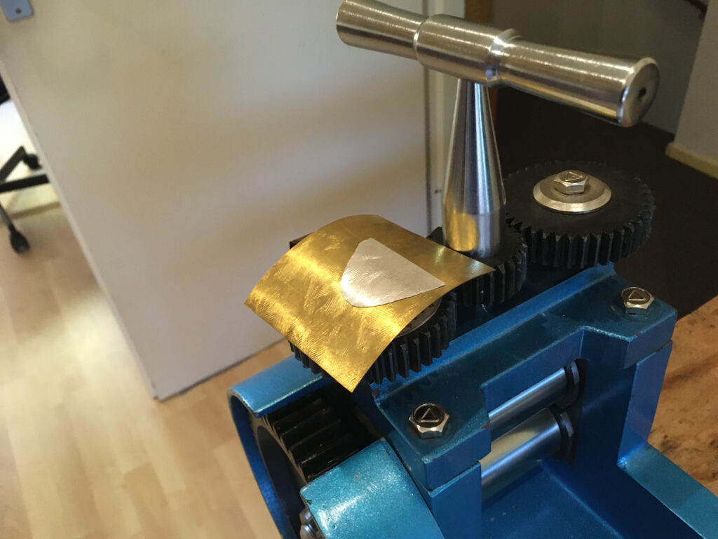 De zilveren bodemplaat wordt gewalst met de speciaal gemaakte messing plaat. Daarna wordt de vorm uitgezaagd en bol gemaakt.