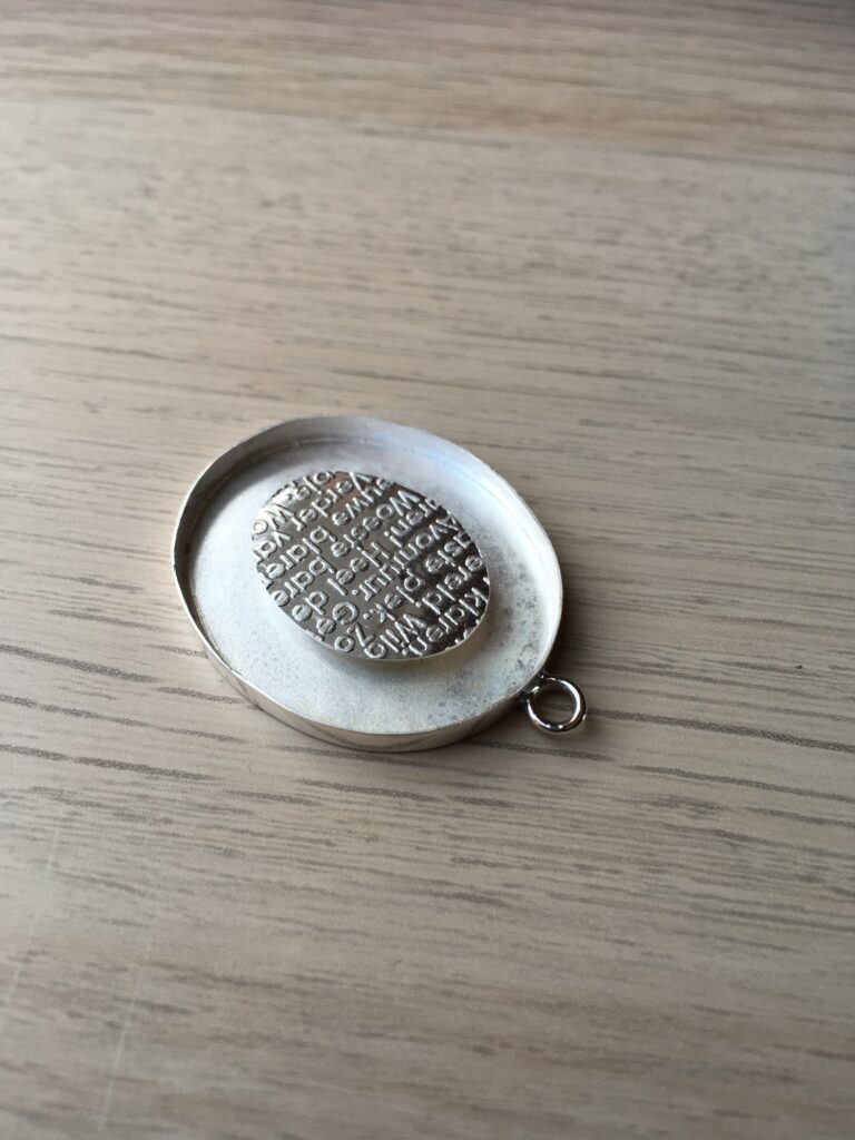 De tekst wordt n.l. als achtergrond-textuur in het sieraad gebruikt.
