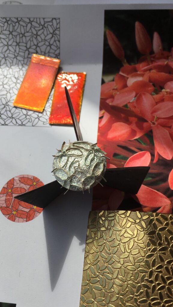 Hier is het sieraad uitgezaagd en gevijld. Ook is er een pin op de achterkant gesoldeerd. Omdat de pin maar 1 mm doorsnee is, wordt een klein buisje aan de voet gesoldeerd zodat de verbinding sterk is. Het buisje gaat straks schuil onder het tegen emaille.