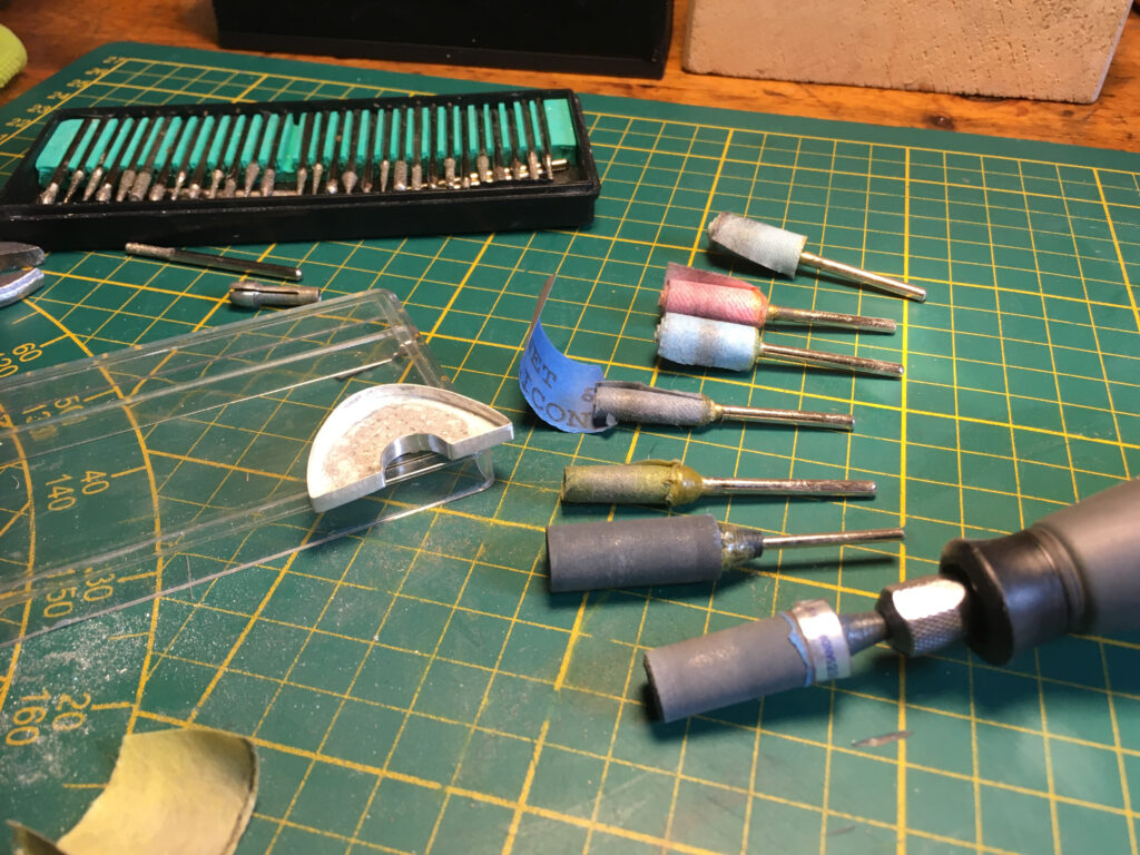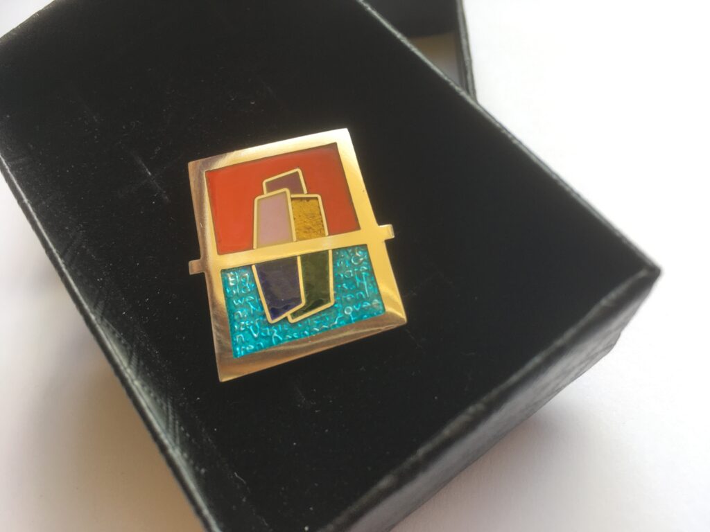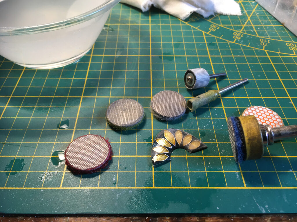 Nadat de kleuren tot aan de bovenkant van de draden en het frame kwamen, werd de speld handmatig vlak geschuurd. Dit om ervoor te zorgen dat de hoeken niet per ongeluk zouden worden afgerond. Ook de zijkant werd geschuurd. Bij het schuren begin je met een diamantvijl van 200 grit, daarna polijstpapier van 400 grit, 600grit, 1200 grit en 4000 grit.
