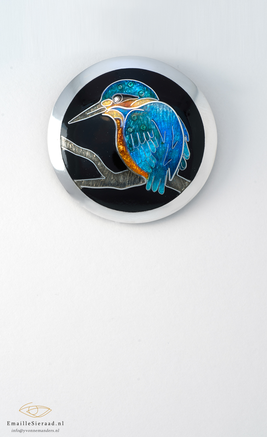 In dit sieraad zitten een paar nieuwe technieken verwerkt: het ‘stapelen’ van kleuren om tinten te mengen. Ook zijn er kleine stukjes zilver tussen de lagen emaille gestookt om extra detail aan te brengen. Onder de oranje borst zit 24 Karaat goudfolie.