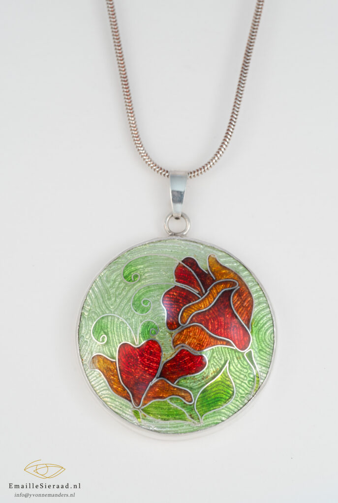Na eindeloos veel testjes ben ik er eindelijk in geslaagd om zonder veel kunstgrepen warme kleuren te gebruiken. Probleem is dat rood/oranje/geel/paars/roze reageert op zilver en verkleurt in een ´modderig bruin`. Door een speciaal ontwikkelde tussenlaag op te brengen, lukt het nu wel!