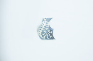 - Na te variëren met de graveerkoppen, druk en hoogte van de ondergrond werd dit patroon in een zilverplaatje gegraveerd.