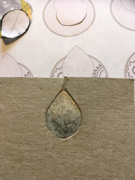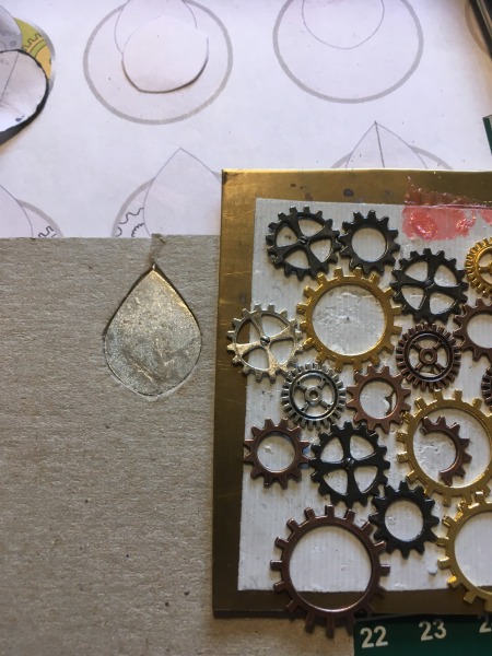 - Omdat alleen dat vormpje een tandwiel-textuur moet krijgen werd de onderplaat afgedekt met karton van dezelfde dikte.